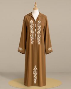 انغمس في التقاليد المغربية مع هذه الجلابة البنية الكلاسيكية، المزينة بـتطريز كريمي معقد يعزز تصميمها...