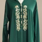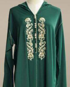 انغمس في الأناقة الخالدة للتراث المغربي مع هذه الجلابة الخضراء الرائعة المزينة بـتطريز ذهبي معقد....