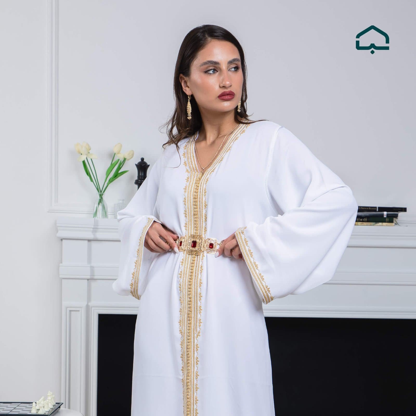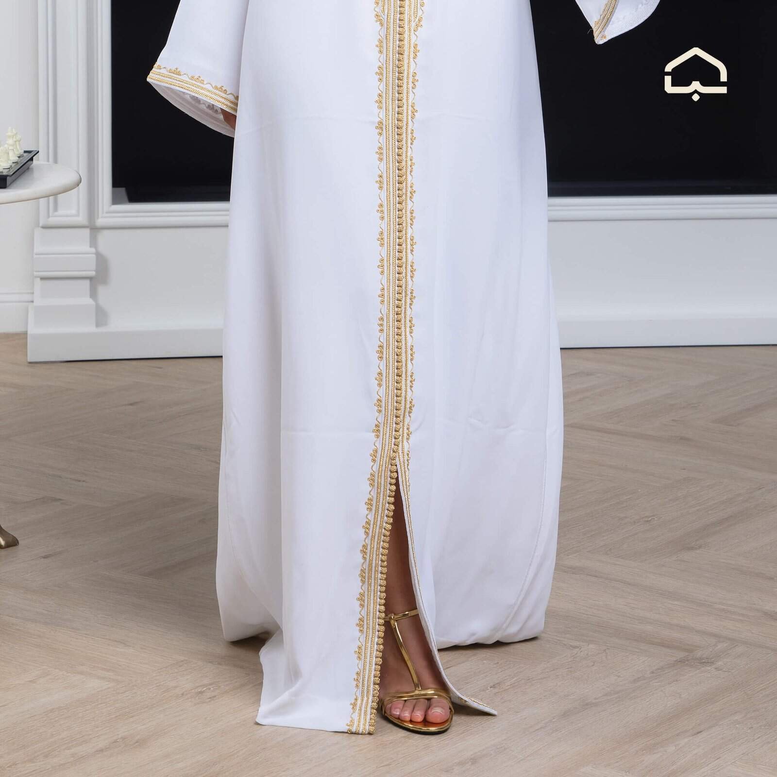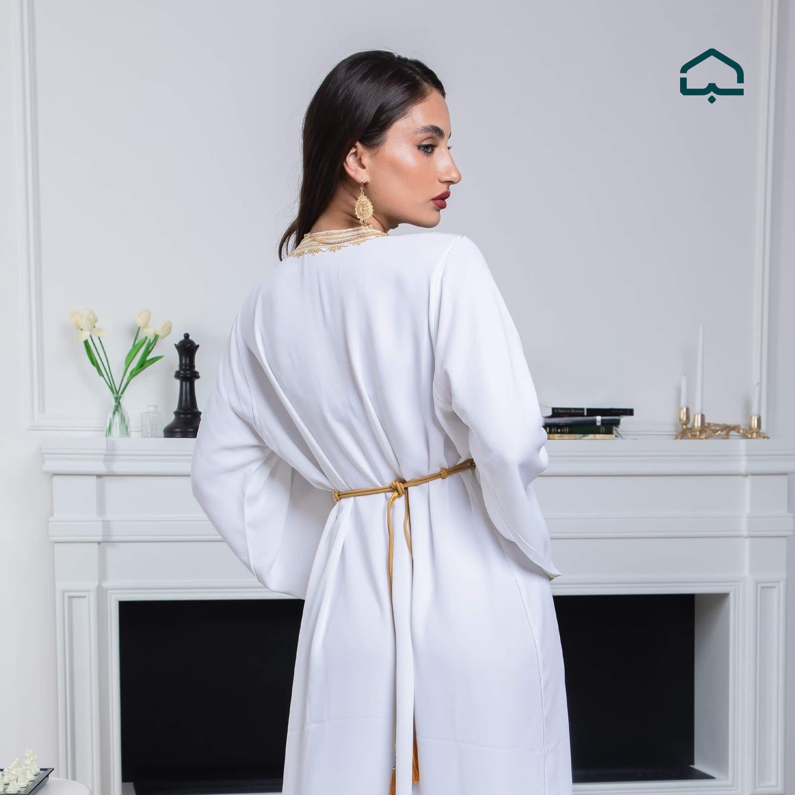 An elegant caftan crafted from luxurious pure white crêpe fabric, meticulously handmade with fine somme threading and traditional Ain Aakda embroidery. Its design embodies the purity of white and the grace of refined simplicity, offering you a feminine presence filled with serene sophistication and timeless luxury.