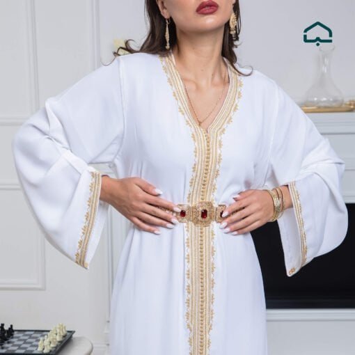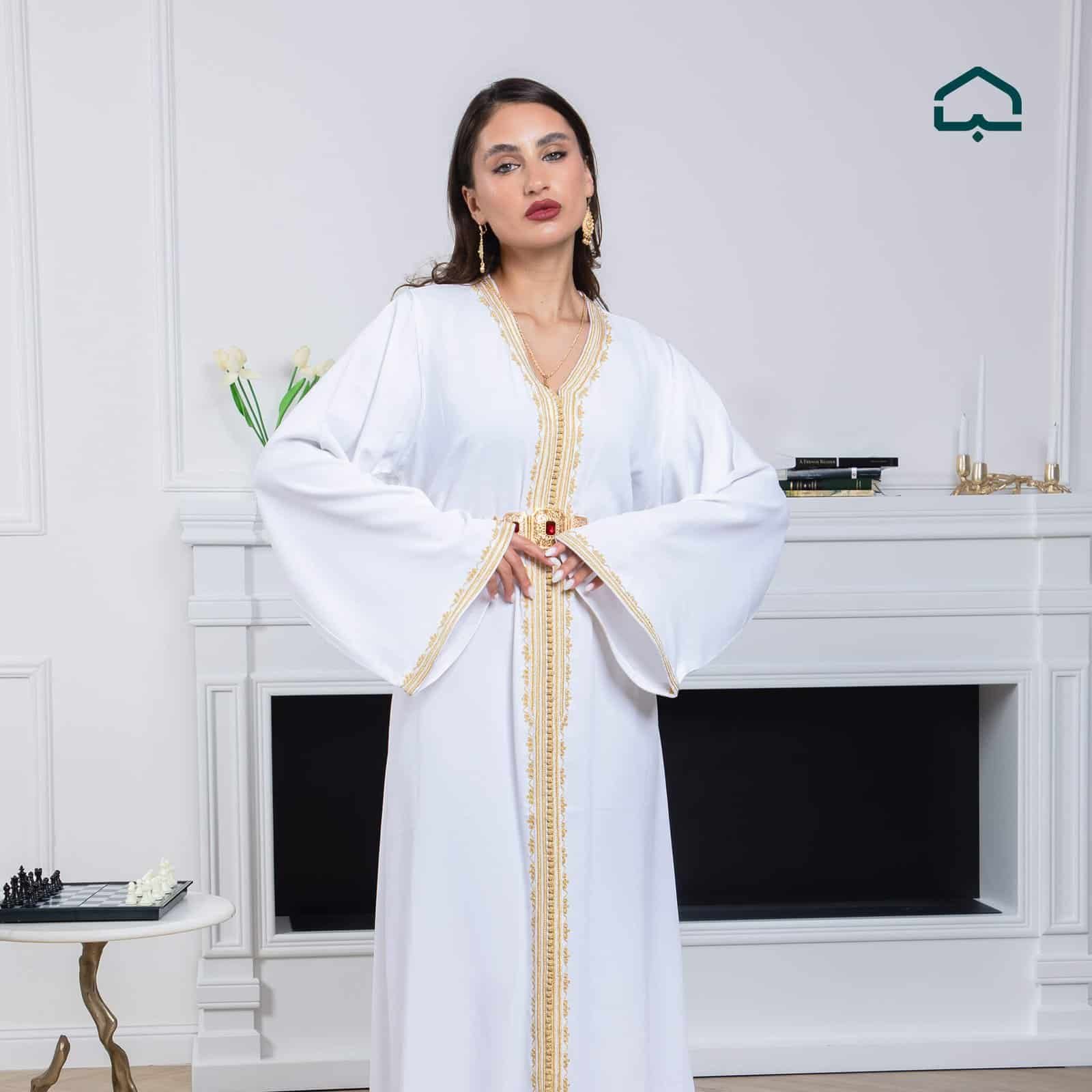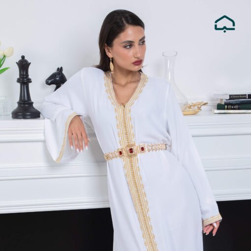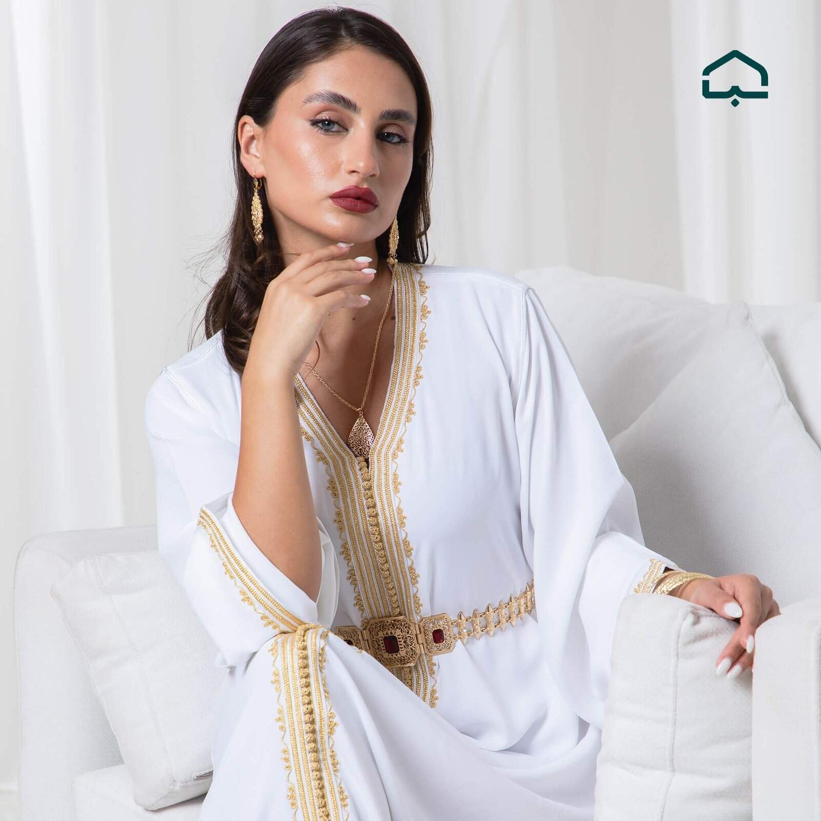 An elegant caftan crafted from luxurious pure white crêpe fabric, meticulously handmade with fine somme threading and traditional Ain Aakda embroidery. Its design embodies the purity of white and the grace of refined simplicity, offering you a feminine presence filled with serene sophistication and timeless luxury.