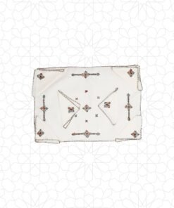 Crafted by skilled Berber women from the heart of the Middle Atlas Mountains, using the double-sided embroidery technique, this Ethnic Moroccan tray cloth boasts identical geometric designs on both sides.